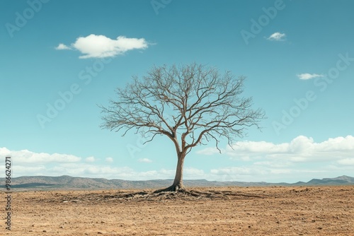 A lone, bare-branched tree stands in a barren, rocky landscape under a blue sky with clouds