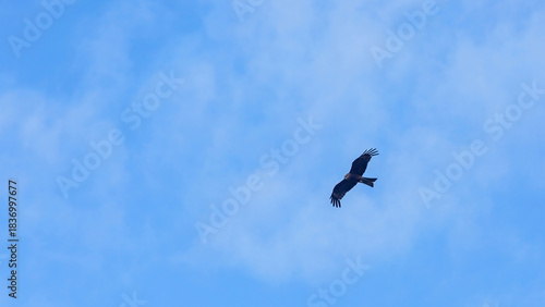 A lone black kite (Milvus migrans) soaring against a blue sky with light white clouds