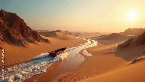 A lone boat glides on a desert stream, carving a path through the golden sand dunes under a vibrant sunset sky, a surreal and captivating scene.