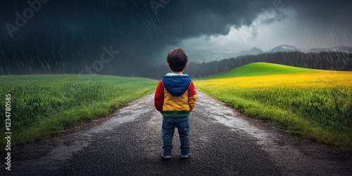 A lone child stands at a crossroad, contemplating the contrasting landscapes of stormy skies and vibrant fields.