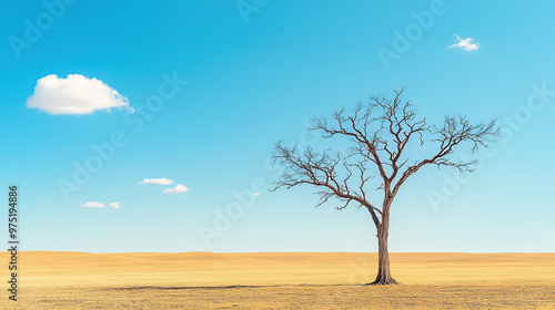 A lone, dead tree stands in the vast savannah under a clear blue sky with just one cloud