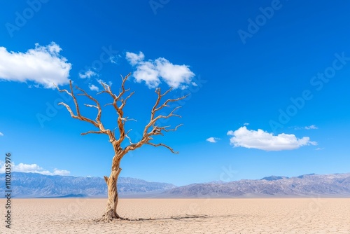 A lone drought-resistant tree rises in the sun-scorched desert, demonstrating nature's adaptability.