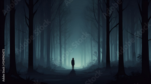 A lone, fading light in a dark, endless forest, symbolizing the struggle to find hope in depression