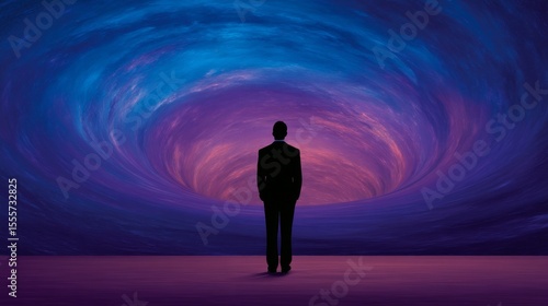 A lone figure in a suit stands facing a swirling cosmic vortex of blue and purple hues, evoking mystery and contemplation.