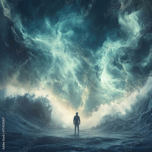 A lone figure stands amidst a turbulent sea, facing a mesmerizing, ethereal cosmic storm.