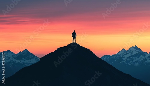A lone figure stands atop a mountain peak, silhouetted against a vibrant sunset, showcasing the beauty of nature and solitude.