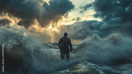 A lone figure stands in stormy waters, facing towering waves beneath dark clouds and striking lightning in the distance.