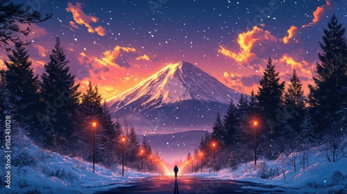 A lone figure stands on a snow-covered road, gazing at a majestic snow-capped mountain under a vibrant sunset sky.