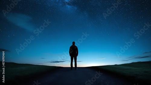 A lone figure stands silhouetted against a vibrant sunset, gazing out at the vastness of nature