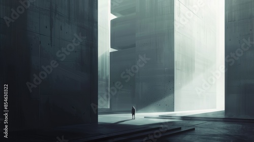 A lone figure walks in a vast, minimalistic industrial space with giant concrete structures and dramatic lighting, symbolizing loneliness and scale.