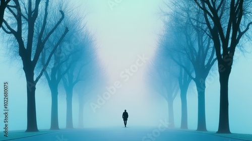 A lone figure walks through a deserted, fog shrouded street, their shadow stretching long and thin in the soft, diffused light.