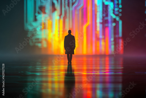 A lone figure walks towards a vibrant digital landscape of neon circuitry