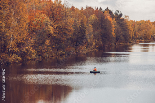a lone fisherman catches a fish from a boat in the middle of a lake on an autumn morning