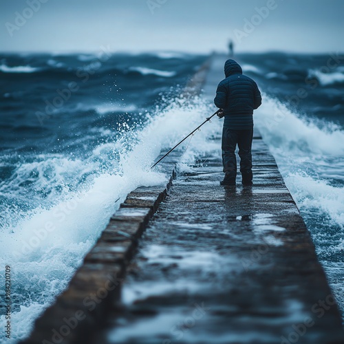 A lone fisherman on a pier faces turbulent waves, capturing the essence of solitude and determination in nature's embrace.