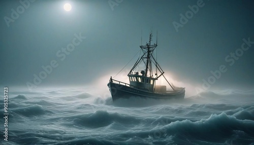 A lone fishing boat braving a foggy, freezing night at sea, surrounded by towering waves and icy mist as it fights against the elements.