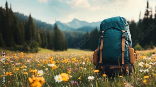 A lone green backpack stands on a vibrant wildflower meadow with distant mountains, symbolizing adventure, exploration, and the call of the wild in lush nature.