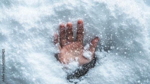 A lone hand breaks through the snow’s surface, a silent cry for rescue amid the avalanche.