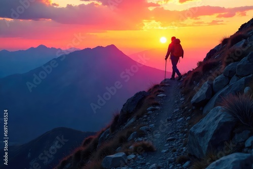 A lone hiker ascends a steep, rocky mountain path, silhouetted against a vibrant sunset The rugged terrain and challenging climb are evident in the image , terrain, expedition