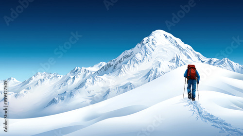 A lone hiker exploring a snowy mountain landscape under a clear blue sky.