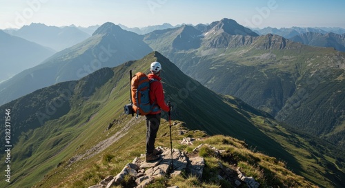 A lone hiker gazes over a breathtaking mountain range on a sunny day