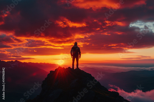A lone hiker silhouetted against a fiery sunset overlooking a vast mountain range and a sea of clouds breathtaking scenery