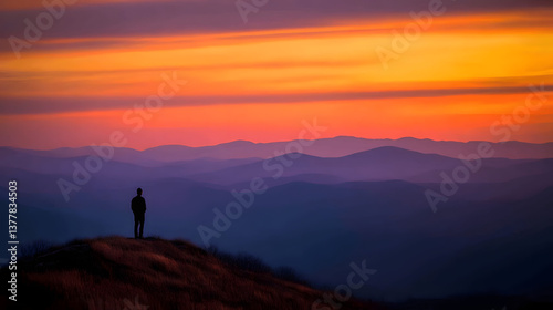 A lone hiker stands on a mountain top, gazing at a stunning sunrise over layered hills, evoking a sense of adventure and tranquility.