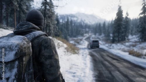 A lone hiker with a snow-covered backpack pauses on a snowy road, watching a vehicle disappear into the distance amidst a frosty mountain landscape. : Generative AI
