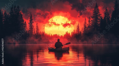 A lone kayaker paddles across a still lake, silhouetted against a fiery sunset, with tall pine trees lining the shores.