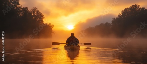 A lone kayaker paddles through a misty river at sunrise, with the golden light illuminating the water and the surrounding trees.