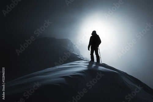A Lone Mountaineer Silhouetted Against A Bright, Misty Summit, Conquering The Peak In A Breathtaking Display Of Determination And Resilience, Under A Dramatic, Ethereal Light