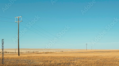 A lone power pole stands tall in a vast field, with a clear blue sky overhead.