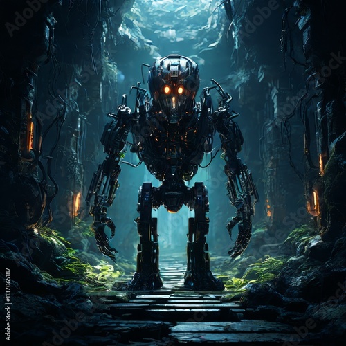 A lone robot stands in a dark and mysterious underground tunnel, its glowing eyes piercing through the shadows. The overgrown plants and dim light create an eerie, sci-fi atmosphere, perfect for