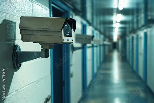 A lone security camera watches over a deserted hallway, its lens capturing the sterile emptiness of a forgotten space.