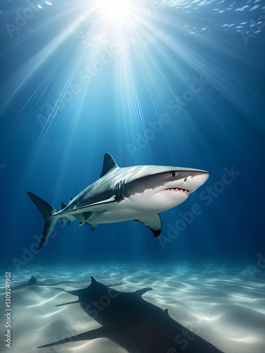 A lone shark in the ocean depths, rays of light playing in the water, an underwater scene.