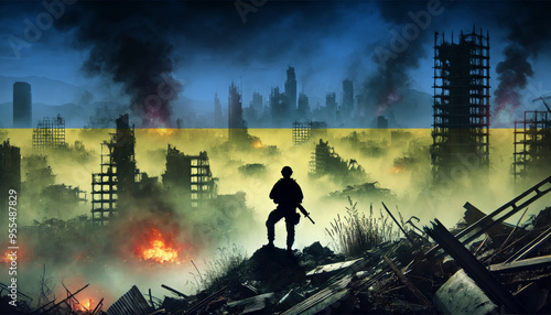 A lone soldier surveys a city in ruins, with the Ukraine flag faintly overlaying the scene, representing the courage and determination of forces in times of war.
