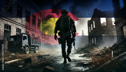 A lone soldier walking through a war-torn urban landscape with the Colorado flag overlay, symbolizing the bravery and resilience of military forces in conflict zones.