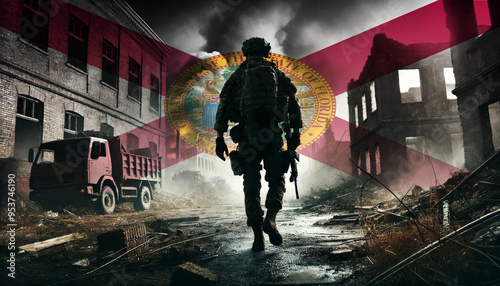 A lone soldier walking through a war-torn urban landscape with the Florida flag overlay, symbolizing the bravery and resilience of military forces in conflict zones.