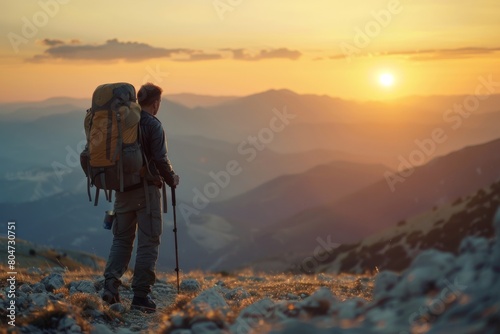 A lone traveler with a backpack stands before a breathtaking mountain sunset, embodying adventure and discovery