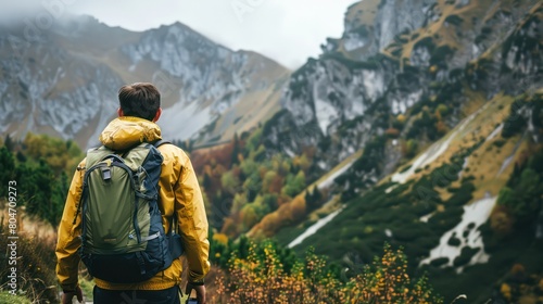 A lone traveler with a yellow backpack contemplates the beauty of the snow-covered mountains, surrounded by autumn foliage