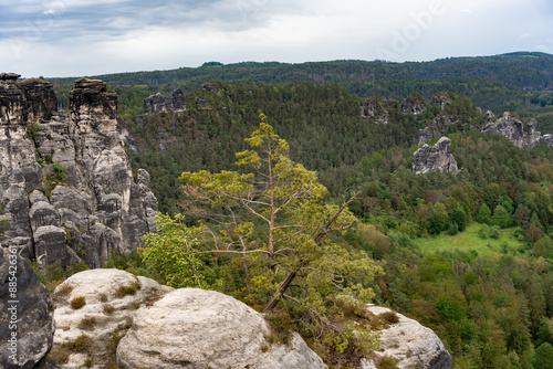 A lone tree stands in the middle of a lush green forest. The tree is surrounded by rocks and the sky is cloudy. Concept of solitude and tranquility