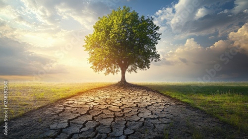 A lone tree stands proudly on cracked earth under a bright sky, symbolizing resilience and hope amidst a changing landscape.
