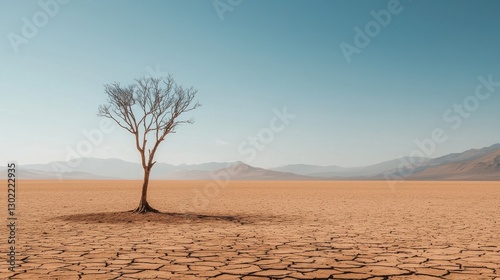 A lone weathered tree stands tall and resilient in the vast parched landscape of the arid desert under a cloudless azure sky The cracked barren earth stretches out endlessly highlighting the stark