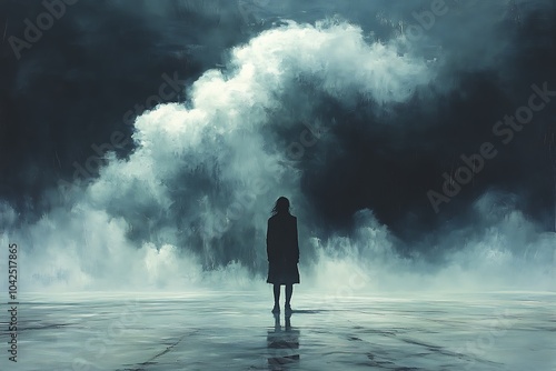 A lone woman stands before an approaching storm, a symbol of resilience.