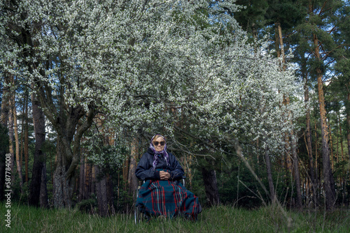 A lonely elderly woman in a stroller, wrapped in a warm blanket, under a spring flowering tree.