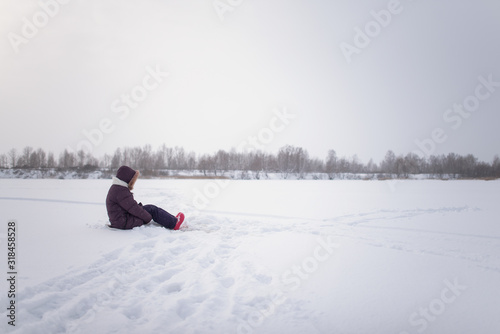 A lonely girl sits on the snow ice of a winter lake, clasping her knees with her hands.