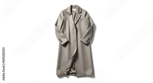 A long, beige coat is laid flat on a white background, showcasing its design and texture.