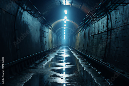 A long, dark tunnel with a wet floor and a bright light in the back