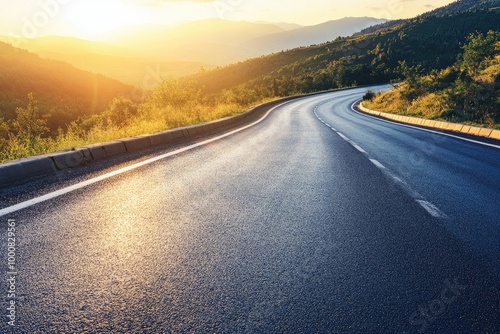 A long, empty asphalt highway at sunrise, with warm golden light reflecting off the road and casting shadows from nearby hills.
