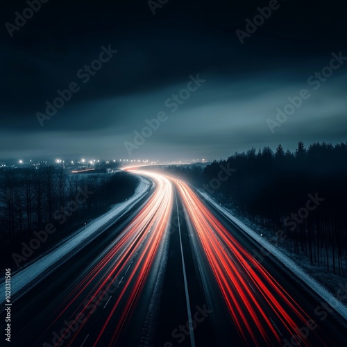 A long exposure shot of a highway at night with streaks of red and white headlights.