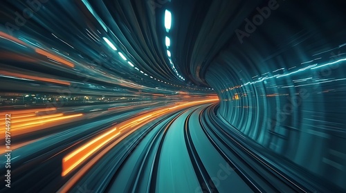 A long exposure shot of a train moving through a tunnel with bright lights and motion blur effect